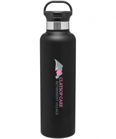 24 oz powder coated double wall 18/8 stainless steel thermal bottle with copper vacuum insulation, threaded gear-shaped insulated lid and carrying handle Complies with FDA, Prop 65. 11.25" H x 3" W