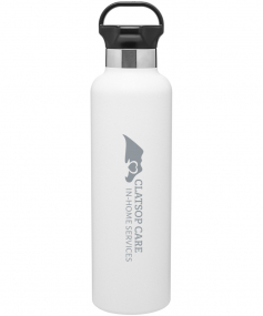 24 oz powder coated double wall 18/8 stainless steel thermal bottle with copper vacuum insulation, threaded gear-shaped insulated lid and carrying handle Complies with FDA, Prop 65. 11.25" H x 3" W