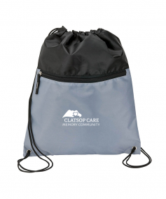 Sport bag with a contrast color front-zippered pocket, reinforced corners and a drawstring closure. Drawstrings double as backpack straps. 12 1/2" W x 15 1/2" H x 3/16" D.